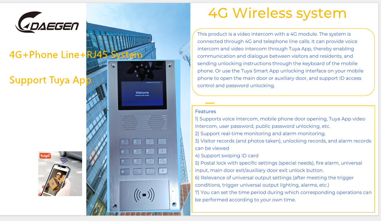 With a 4G module, this product uses a data SIM card (one per unit) to connect with hosted services, enabling connections via 4G and telephone line for calls, and supports audio and video communication through the Tuya App.