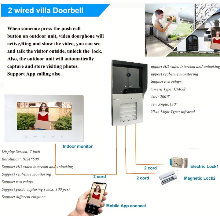 2 Wired Video Doorbell Villa Intercom System in high solution HD 1080P camera 200W Pixel